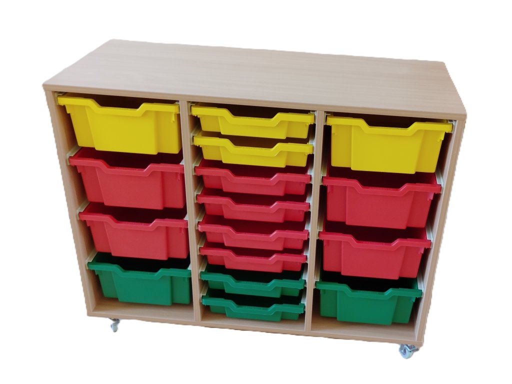 Skříňka na plastové kontejnery Gratnells je na kolečkách s brzdách pro zajištění polohy.